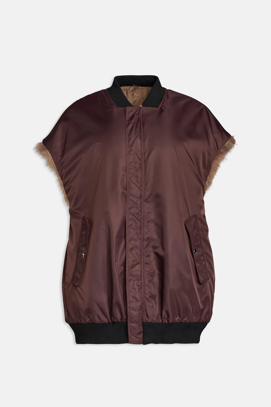 Bomber smanicato doublewear in ecopelliccia e nylon con ricamo aironi